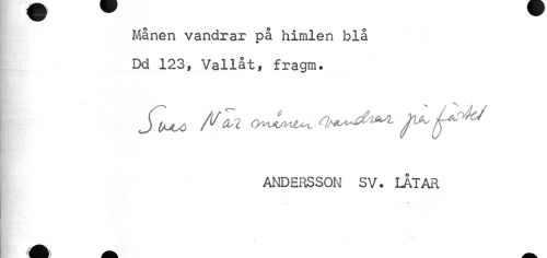 //// Månen vandrar på himlen blå Dd 123, Vallåt, fragm. //// Jl^ /ifli o^u, ^ ^M //// ANDERSSON SV. LÅTAR //// V. ////