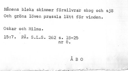 //// Månens bleka skimmer försilvrar skog och sjö Och gröna löven prassla lätt för vinden. //// Oskar och Hilma. //// 15:7. PÄ. S.L.S. 262 s. 18-25 //// nr 8. //// * //// ÅBO ////