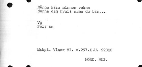 //// ^ Många kära minnen vakna //// denna dag hvars namn du bär... //// Vg //// Fors sn //// Mskpt. Visor VI. S.297.E.U. 22828 //// NORD. MUS. ////