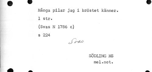 //// Många pilar jag i bröstet känner. 1 str. //// » //// (Svas N 1786 c) s 224 //// r*vo //// SÖDLING MS mel.not. ////