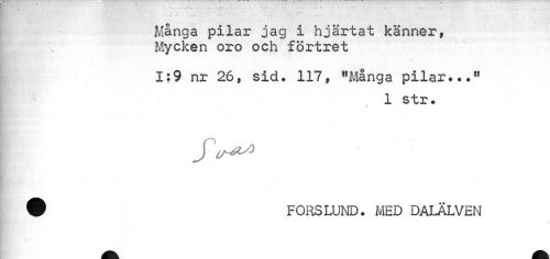 //// — ___ - ' //// Många pilar jag i hjärtat känner, Mycken oro och förtret //// 1:9 nr 26, sid. 117, "Många pilar..." //// 1 str. //// ® FORSLUND. MED DALÄLVEN ////