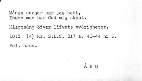 //// Många sorger har jag haft, Ingen man har Gud mig skapt. //// Klagosång öfver lifvets svårigheter. //// 10:5 (4) Kl. S.L.S. 317 s. 43-44 nr 6. //// Mel. hänv. //// ÅBO ////