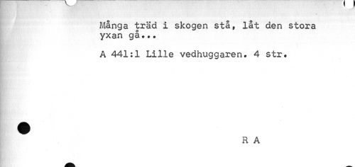 //// Många träd i skogen stå, låt den stora yxan gå... //// A 441:1 Lille vedhuggaren. 4 str. //// R A ////