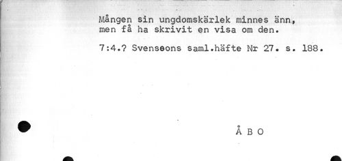 //// - ' - - - . //// Mången sin ungdomskärlek minnes ann, men få ha skrivit en visa om den. //// 7:4.? Svenseons saml.häfte Nr 27. s. 188. //// ^Hrai^A v-V* ; ¦ //// ^ ÅBO ////