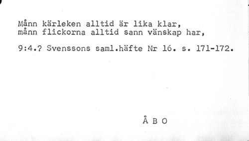 //// Mann kärleken alltid är lika klar, månn flickorna alltid sann vänskap har, //// 9:4.? Svenssons saml.häfte Nr 16. s. 171-172. //// * //// t //// ÅBO ////