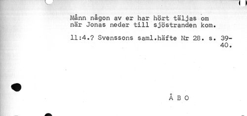 //// Månn någon av er har hört täljas om när Jonas neder till sjöstranden kom. //// 11:4.? Svenssons saml.häfte Nr 28. s. 39- //// 40. //// ÅBO ////