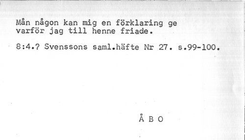 //// Mån någon kan mig en förklaring ge varför jag till henne friade. //// • ' I //// 8:4.? Svenssons saml.häfte Nr 27. s.99-100. //// } //// ÅBO //// * j ////