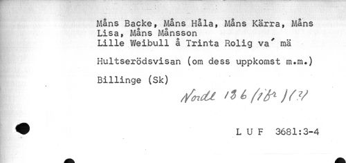 //// Mans Backe, Måns Håla, Måns Kärra, Måns //// Lisa, Måns Månsson //// Lille Weibull å Trinta Rolig va' mä //// Hultserödsvisan (om dess uppkomst m.nu) Billinge (Sk) //// //<ndl ité {tå* //// & L U F 3681:3-4 //// • - ////