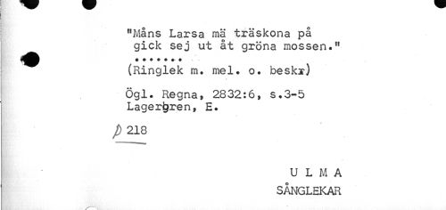 //// "Måns Larsa mä träskona på gick sej ut åt gröna mossen." //// (Ringlek m. mel. o. beskx) //// s //// Ögl. Regna, 2832:6, s.3-5 Lagergren, E. //// P 218 //// U L M A SÅNGLEKAR ////