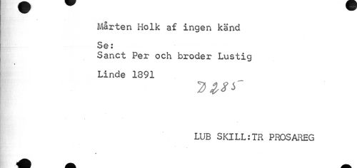 //// Mårten Holk af ingen känd Se: //// Sanct Per och broder Lustig //// » //// Linde 1391 //// LUB SKILL:TR PROSAREG //// 9 ////