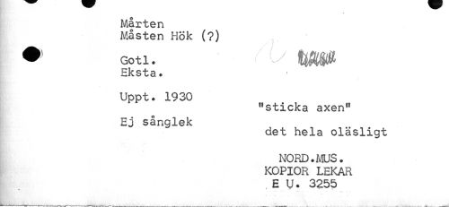 //// » //// Mårten //// Måsten Hök (?) //// • Gotl. • V HM0 //// Eksta. //// Uppt. 1930 //// "sticka axen" //// Ej sånglek //// det hela oläsligt //// NORD.MUS. KOPIOR LEKAR //// . E U. 3255 //// " " ... " ' ' * ////