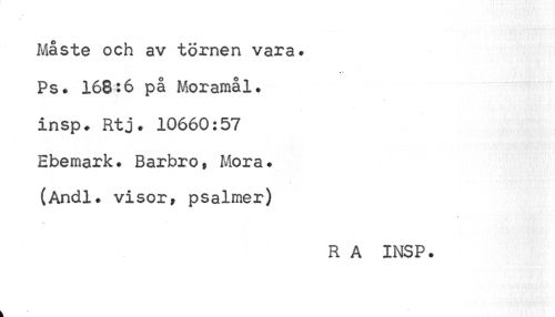 //// Måste och av tornen vara. //// • * //// Ps. 168:6 på Moramål. insp. Rtj. 10660:57 Ebemark. Barbro, Mora. (Andl. visor, psalmer) //// R A INSP. //// - ////
