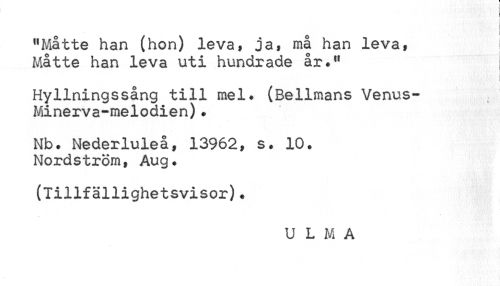 //// I //// "Måtte han (hon) leva, ja, må han leva, Måtte han leva uti hundrade år." //// Hyllningssång till mel. (Bellmans Venus-Minerva-melodien). //// Nb. Nederluleå, 13962, s. 10. Nordström, Aug. //// (Tillfällighetsvisor). //// U L M A ////