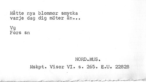 //// Måtte nya blommor smycka varje dag dig möter än... //// Vg //// Fors sn //// NORD. MUS. Mskpt. Visor VI. s. 265. E.U. 22828 ////