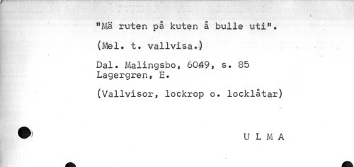 //// ) //// uMä ruten på kuten å bulle uti". (Mel. t. vallvisa.) //// //// /Dal. Malingsbo, 6049, s. 85 Lagergren, E. //// (Vallvisor, lockrop o. locklåtar) //// » //// ULMA ////
