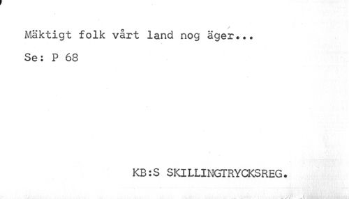 //// Mäktigt folk vårt land nog äger... Se: P 68 //// KB:S SKILLINGTRYCKSREG. //// i ////