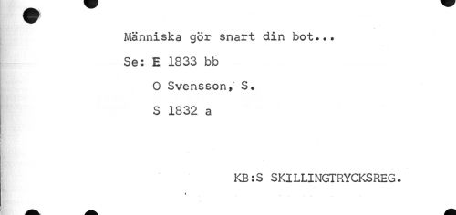 //// Människa gör snart din bot... Se: E 1833 bb //// 0 Svensson, S. S 1832 a //// KB:S SKILLINGTRYCKSREG. ////