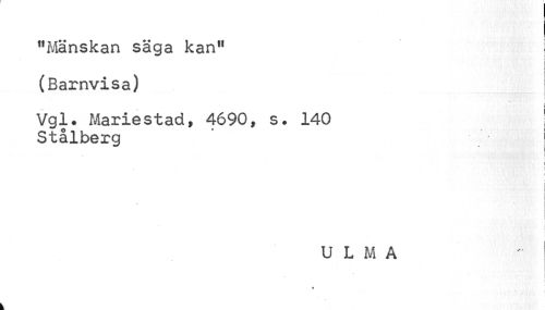 //// "Mänskan säga kan" (Barnvisa) //// Vgl. Mariestad, 4690, s. 140 Stålberg //// f //// > //// i //// U L M A //// , i //// ? ////