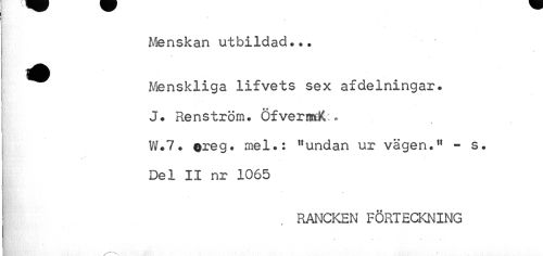 //// q //// Menskan utbildad... //// ^^ Menskliga lifvets sex afdelningar. //// J. Renström. Öfvermdl:* //// » < //// V/.7. ©reg. mel.: "undan ur vägen." - s. Del II nr 1065 //// RANCKEN FÖRTECKNING //// / "k • ////