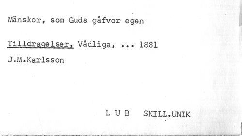 //// % //// Mänskor, som Guds gåfvor egen //// Tilldragelser> Vådliga. 1881 J.M.Karlsson //// L U B SKILL.UNIK //// ___ - , i ////