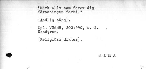 //// "Märk allt som förer dig försoningen förbi»" //// (Andlig sång). //// Upl. Väddö, 303:990, s. 3. Sandgren. //// (Religiösa dikter). //// U L M A //// r f ////