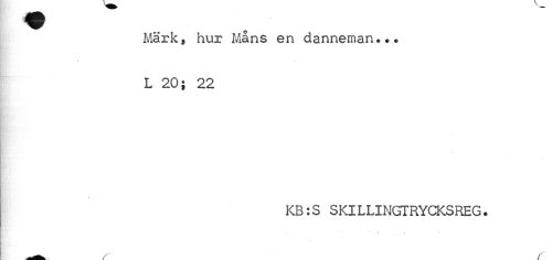 //// fåll ' //// Märk, hur Måns en danneman... L 20; 22 //// KB:S SKILLINGTRYCKSREG. //// ? .. • i ////
