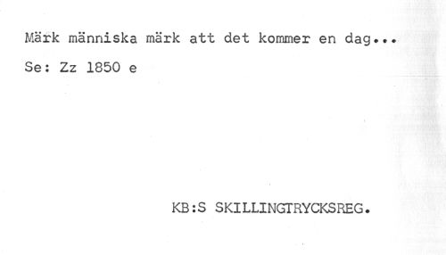 //// Märk människa märk att det kommer en dag... Se: Zz 1850 e //// ! //// KB:S SKILLINGTRYCKSREG. //// \ ////