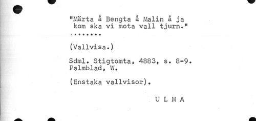 //// "Märta å Bengta å Malin å ja kom ska vi mota vall tjurn." //// (Vallvisa.) //// Sdml. Stigtomta, 4883, s. 8-9. //// Palmblad, W. //// (Enstaka vallvisor). //// U L M A ////