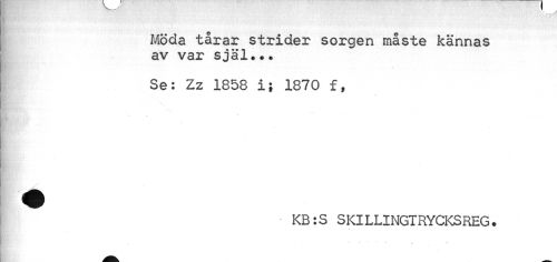 //// v. //// w //// Möda tårar strider sorgen måste kännas av var själ.?. //// Se: Zz 1858 i; 1870 f, //// < //// ¦ KB:S SKILLINGTRYCKSREG. ////