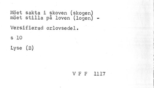 //// I //// Möet sakta i skoven (skogen) möet stilla på loven (logen) - //// Versifierad orlovsedel. 1 //// s 10 //// Lyse (B) ' //// i //// i //// i //// i i //// I //// i I //// V F F 1117 ////