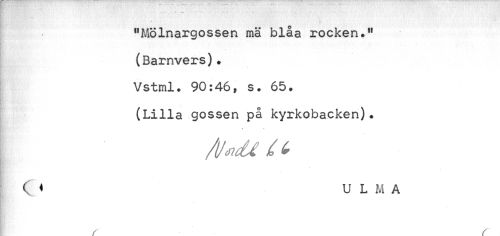 //// "Mölnargossen mä blåa rocken." //// (Barnvers). //// Vstml. 90:46, s. 65. //// (Lilla gossen på kyrkobacken). //// /U<ndl U //// C 4 U L M A //// r f ////