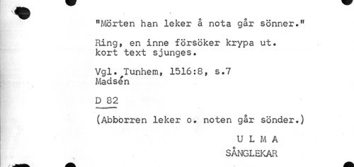 //// "Mörten han leker å nota går sönner." //// Ring, en inne försöker krypa ut. kort text sjunges. //// Vgl. Tunhem, 1516:8, s.7 Madsen //// * //// D 82 //// (Abborren leker o. noten går sönder.) //// U L M A SÅNGLEKAR //// \ ////