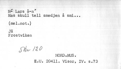 //// N- i-ars a-n //// Mas skull tell smedjen å smi... (mel.not.) Jä //// Frostviken //// NORD. MUS. E.U. 20411. Visor, XV. s.73 //// ' i ' ;. //// 0 ////