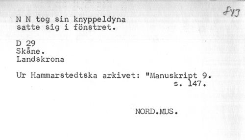 //// /yj //// N N tog sin knyppeldyna satte sig i fönstret. //// D 29 //// Skåne. //// Landskrona //// Ur Hammarstedtska arkivet: "Manuskript 9. //// s. 147. //// b //// NORD.MUS. ////