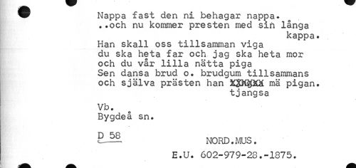 //// w Nappa fast den ni behagar nappa. //// •.och nu kommer presten med sin långa //// kappa. //// Han skall oss tillsamman viga du ska heta far och jag ska heta mor och du vår lilla nätta piga Sen dansa brud o. brudgum tillsammans och själva prästen han mä pigan. //// tjangsa //// Vb. //// Bygdeå sn. //// NORD. MUS • E.U. 602-979-28.-1875. ////
