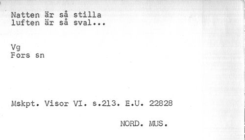 //// I //// Natten är så stilla luften är så sval*.. //// » //// Vg //// Fors sn //// i //// Mskpt. Visor VI. s.213. E.U. 22828 //// NORD. MUS. ////