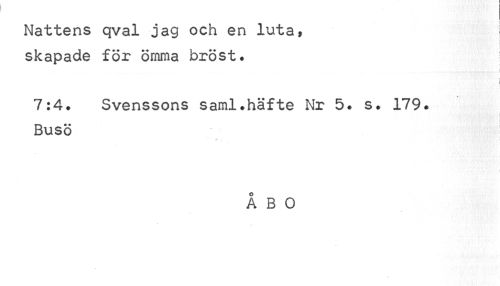 //// Nattens qval jag och en luta, j //// i //// skapade för ömma bröst. //// i //// 7:4. Svenssons saml.häfte Nr 5. s. 179. //// i //// Busö //// 9 ¦ V>> ty * ¦ //// ÅBO ////
