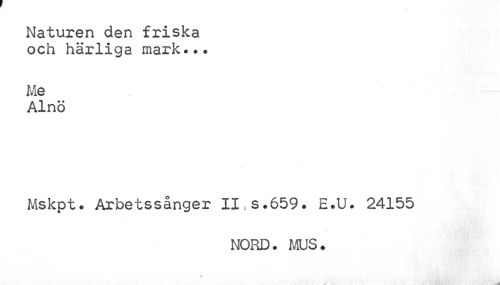 //// Naturen den friska och härliga mark... //// Me //// Alnö //// Mskpt. Arbetssånger II,s.659. E.U. 24155 //// nord. mus. ////