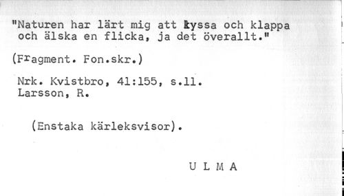 //// "Naturen har lärt mig att kyssa och klappa 1 //// och älska en flicka» ja det överallt." //// s= //// » //// ! //// (Fragment. Fon.skr.) //// \ //// • j //// Nrk. Kvistbro» 41:155» s.ll. Larsson» R. //// (Enstaka kärleksvisor). //// E //// U L M A I //// ¦ //// 1 I ////