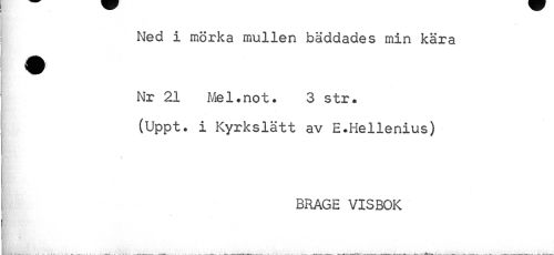 //// Ned i mörka mullen bäddades min kära //// v W //// Nr 21 Mel.not. 3 str. //// (Uppt. i Kyrkslätt av E.Hellenius) //// BRAGE VISBOK //// -X^......___^X H...X * ii. l A. . -----.----— _ - - —----.- * --- ----- _ .. . - — ---—------^ -------—-------*¦——----' r" - — ////