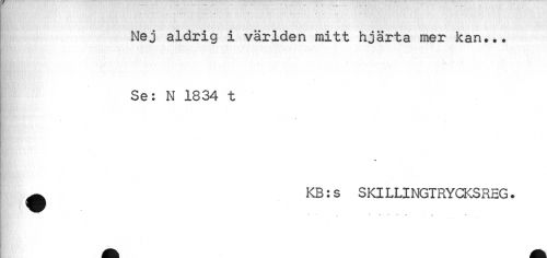 //// .... 1 . _ . _ //// Nej aldrig i världen mitt hjärta mer kan... //// Se: N 1834 t //// ^ KB:s SKILLINGTRYGKSREG. ////