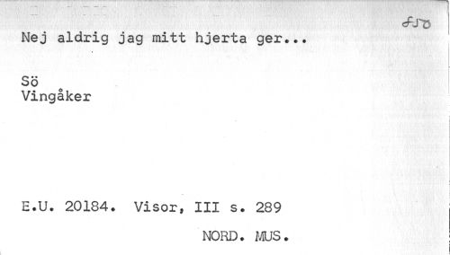 //// <£td //// Nej aldrig jag mitt hjerta ger... //// 9 //// SÖ //// Vingåker //// E.U. 20184. Visor, III s. 289 //// NORD. MUS. i //// i //// i ////