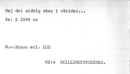 //// Nej det aldrig sker i världen... //// * //// i //// Se: E 1849 zz //// i //// W.v.Braun enl. LUB //// i t //// KB:s SKILLINGTRYCKSREG. //// y //// i //// I i //// i ////