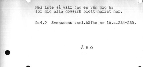 //// * //// Nej inte så viit jag en vän mig ha för mig alla gossark blott narrat har, //// 5:4.? Svenssons saml.häfte nr 16.s.234-235. //// ÅBO ////