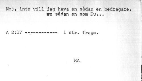 //// Nej, inte vill jag hava en sådan en bedragare, //// wn sådan en som Du... //// i //// | //// A 2:17 —:—----—¦— 1 str. fragm. //// i //// L r //// RA //// i //// B //// i ¦ //// j ////