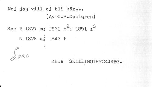 //// Nej jag vill ej bli kär... //// (Av C.F.Dahlgren) //// Se: E 1827 m; 1831 b2; 1851 a3 //// N 1828 aj 1843 £ //// * //// 3 jHW //// KB:s SKILLINGTRYCKSREG. ////