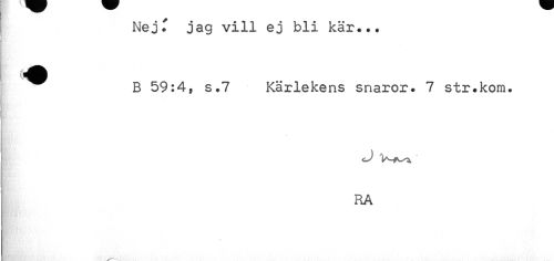 //// Nej T jag vill ej bli käx... //// ¦fe //// 1 B //// B 59:4, s.7 Kärlekens snaror. 7 str.kom. //// cJ V-*^ //// RA ////