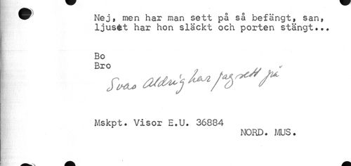 //// ^ Nej, men har man sett på så befängt, san, //// ljusét har hon släckt och porten stängt».* //// Bo //// Bro ,, ? //// m //// Mskpt. Visor E.U. 36884 //// NORD. MUS. ////