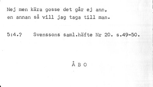 //// Nej men kära gosse det går ej ann, //// j! //// en annan så vill jag taga till man. //// 5:4.? Svenssons saml.häfte Nr 20. s.49-50. //// j* • 1 //// I i //// » | //// c //// i //// : //// ÅBO ////