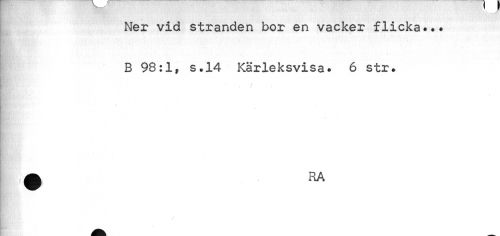 //// —"" N-. //// Ner vid stranden bor en vacker flicka..» //// | ' //// B 98:1» s.14 Kärleksvisa. 6 str. //// i //// < //// v //// • RA //// v ////